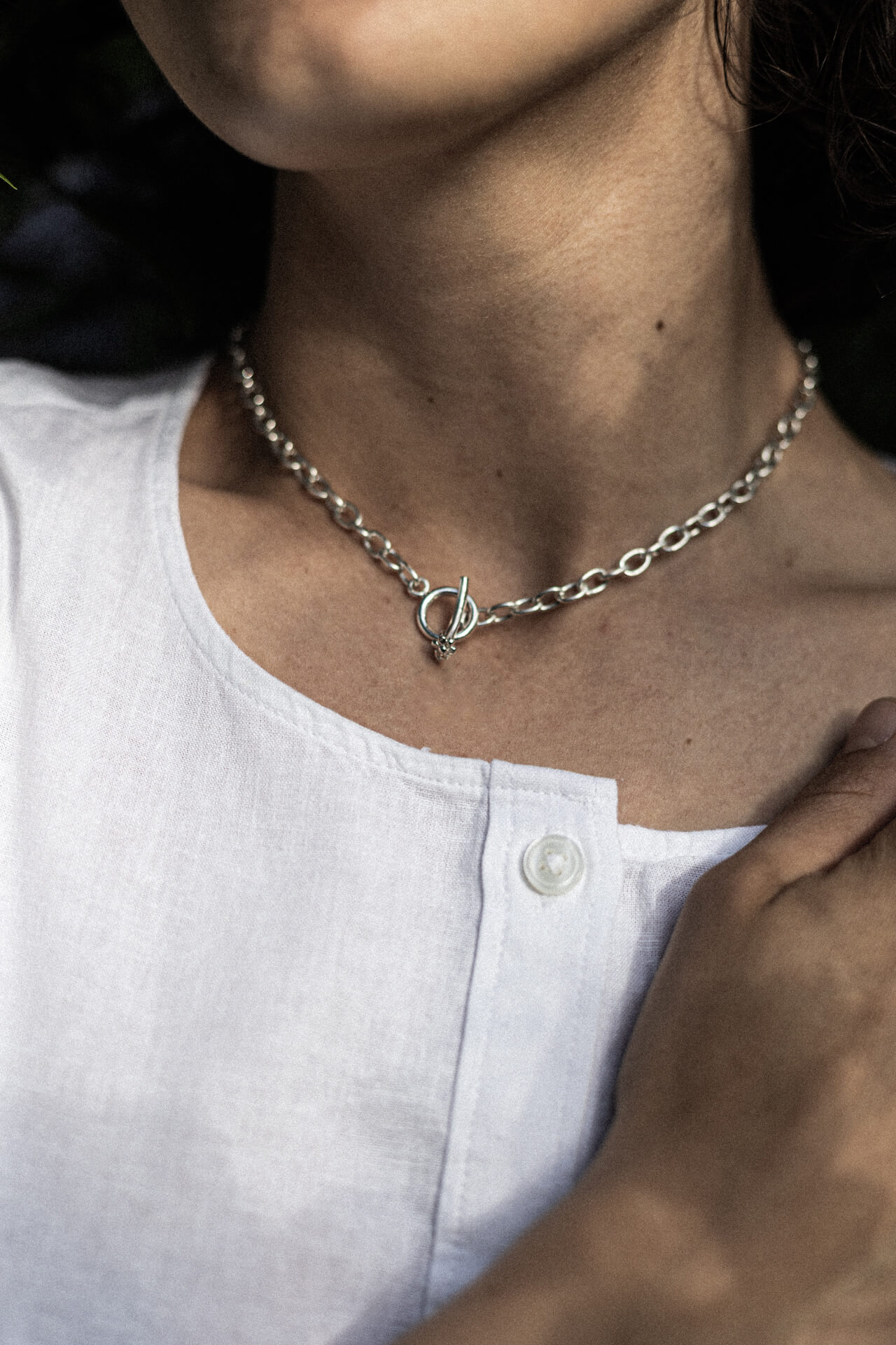 Naszyjnik bazowy to naszyjnik złożony z grubego łańcuszka o długości 41 cm z zapięciem przekładanym wykonanym z grubego kółka i przełożonej przez niego łodyżki zakończonej małym kwiatuszkiem.