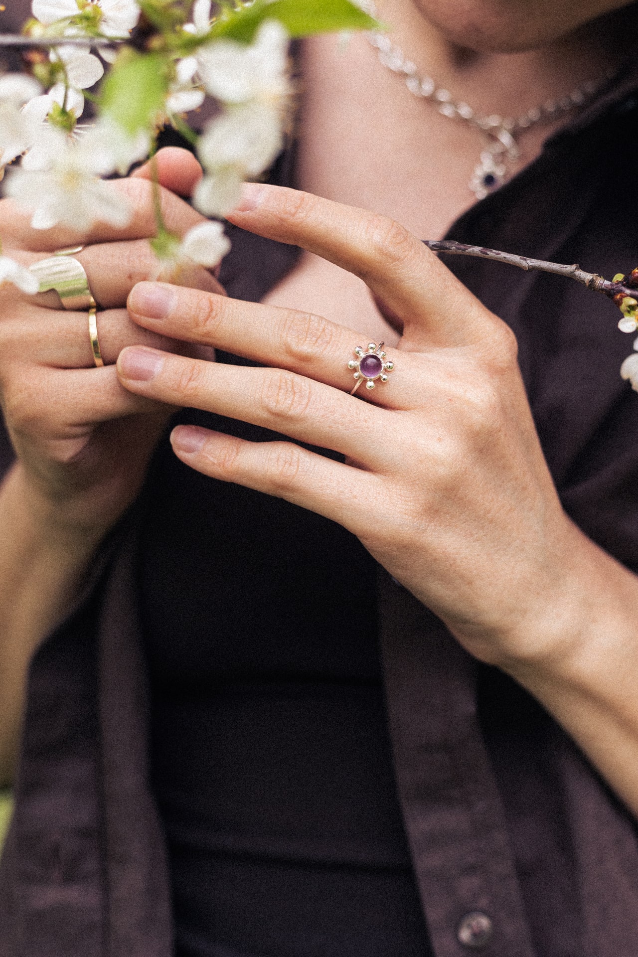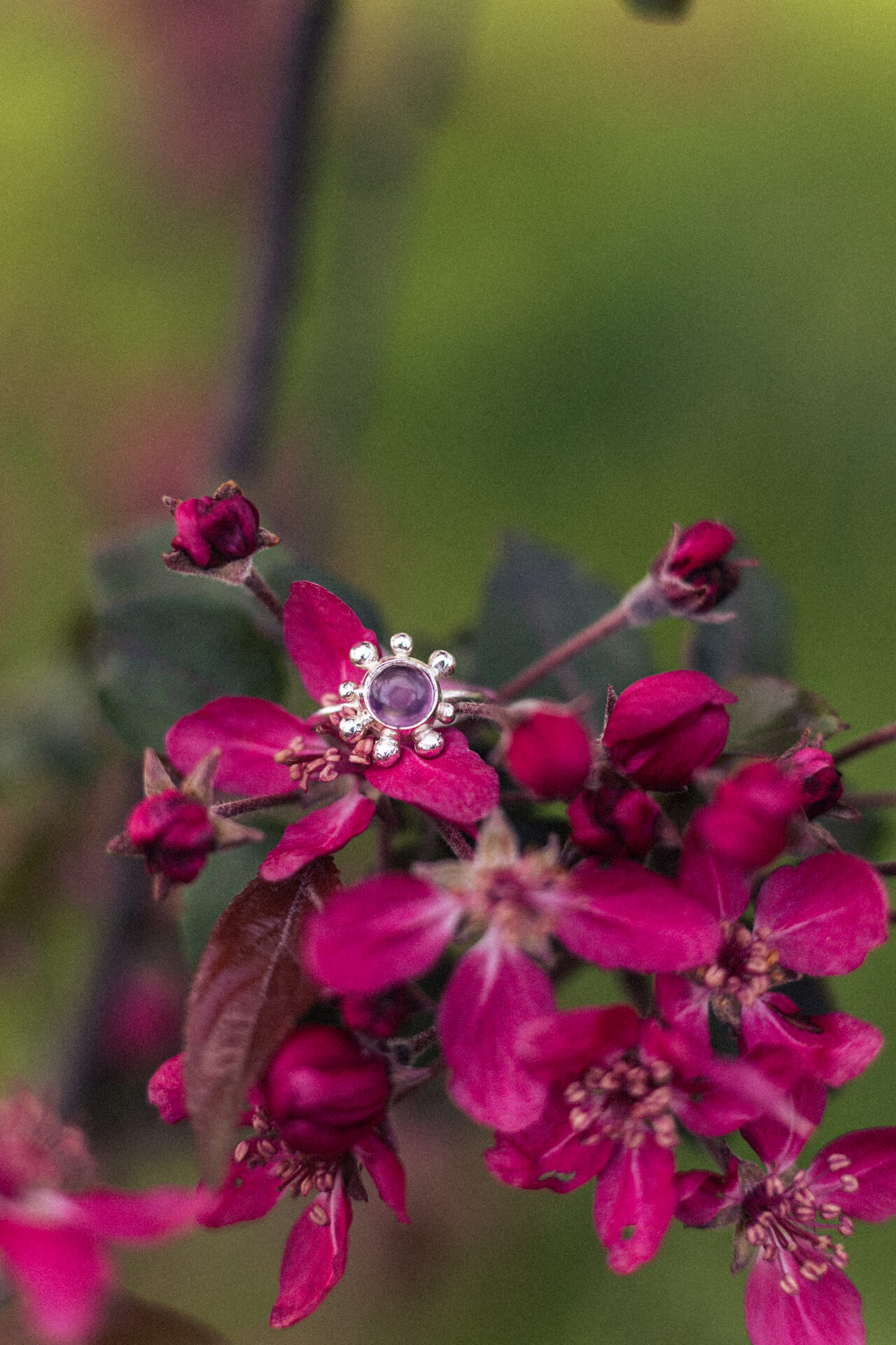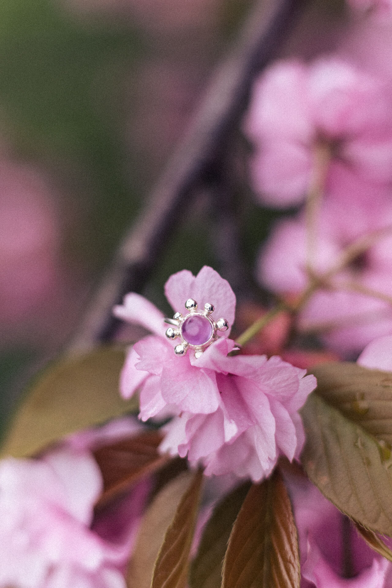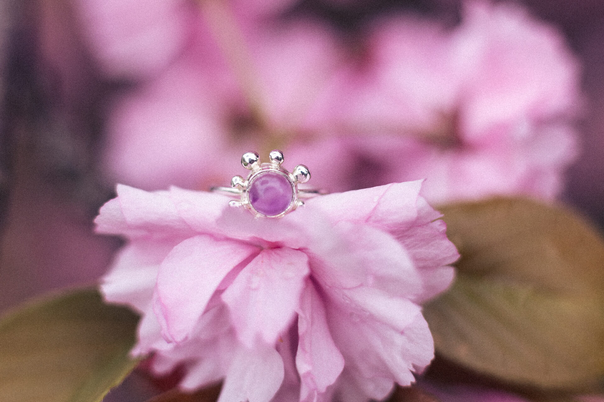 Pierścionek KWITNĄCA WIŚNIA to zawiadiacki pierścionek z sześciomilimetrowym fioletowym ametystem (jasny lub ciemny kaboszon) i nieregularnymi kulkami dookoła. Wykonany techniką odlewu. Jedyne możliwe wykończenie w tym modelu to poler.
