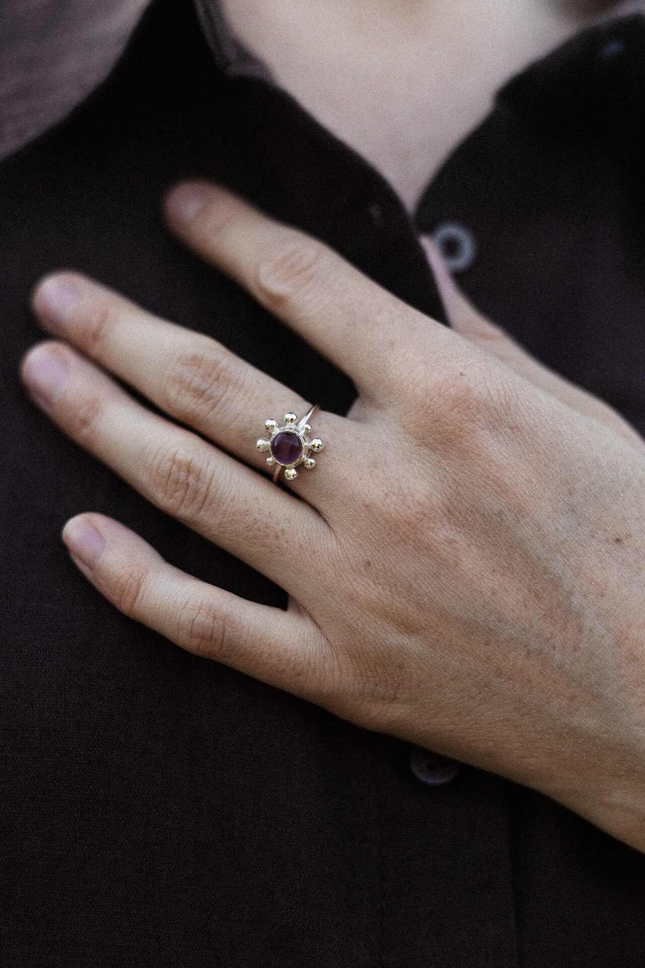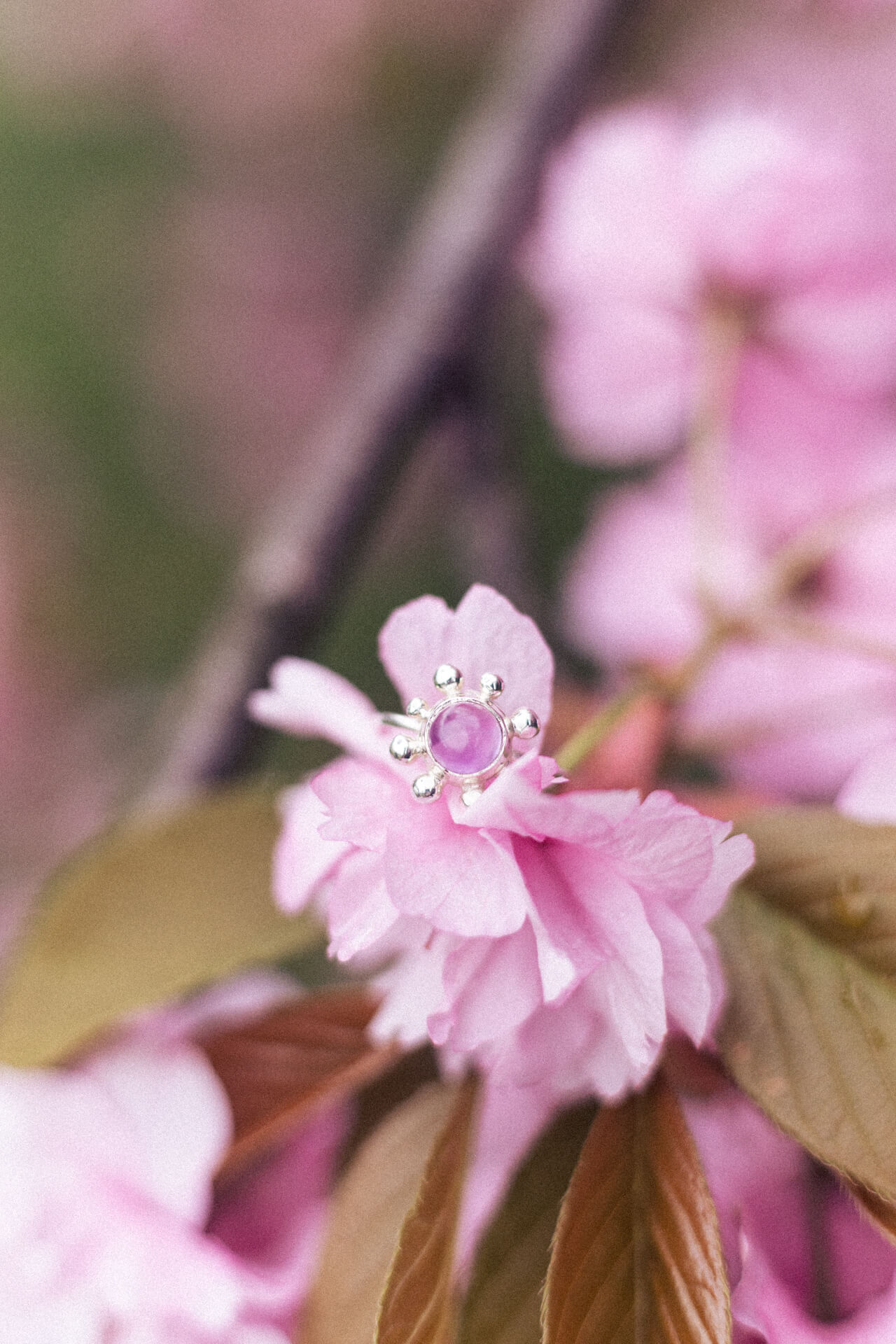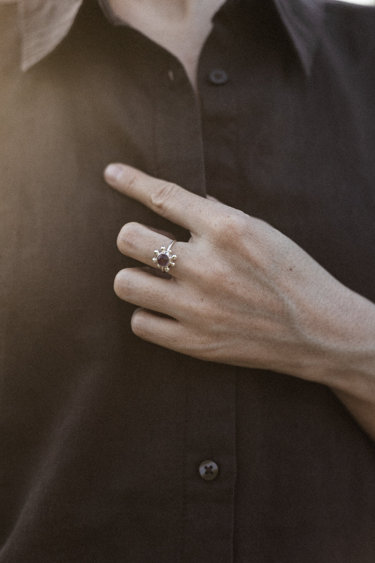 Pierścionek KWITNĄCA WIŚNIA to zawiadiacki pierścionek z sześciomilimetrowym fioletowym ametystem (jasny lub ciemny kaboszon) i nieregularnymi kulkami dookoła. Wykonany techniką odlewu. Jedyne możliwe wykończenie w tym modelu to poler.