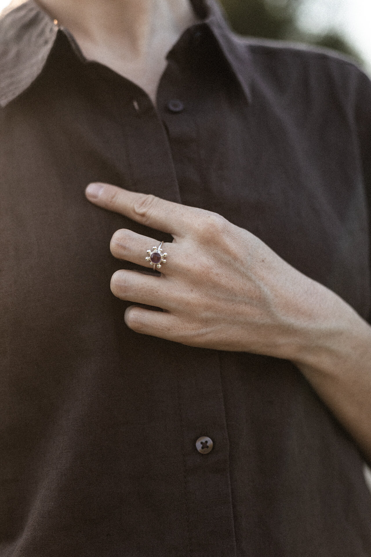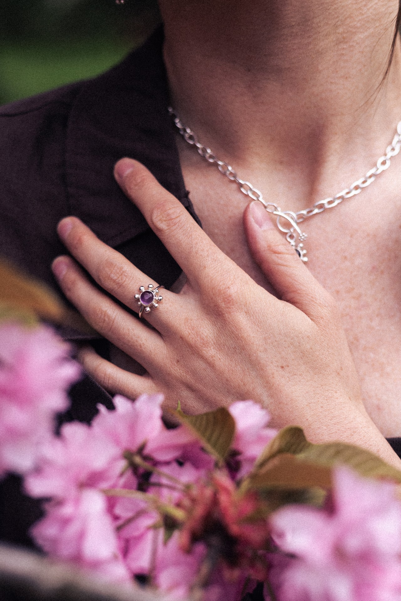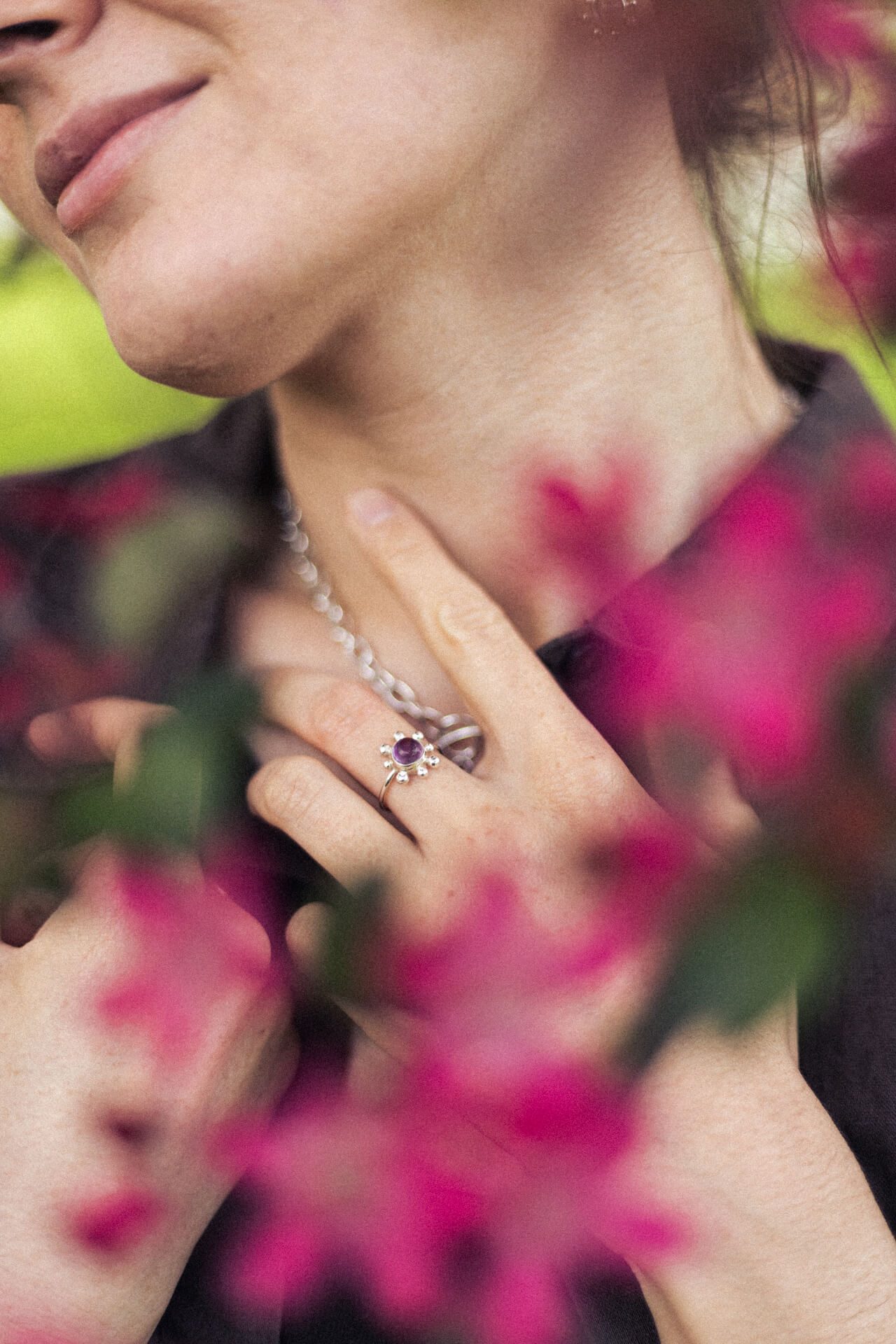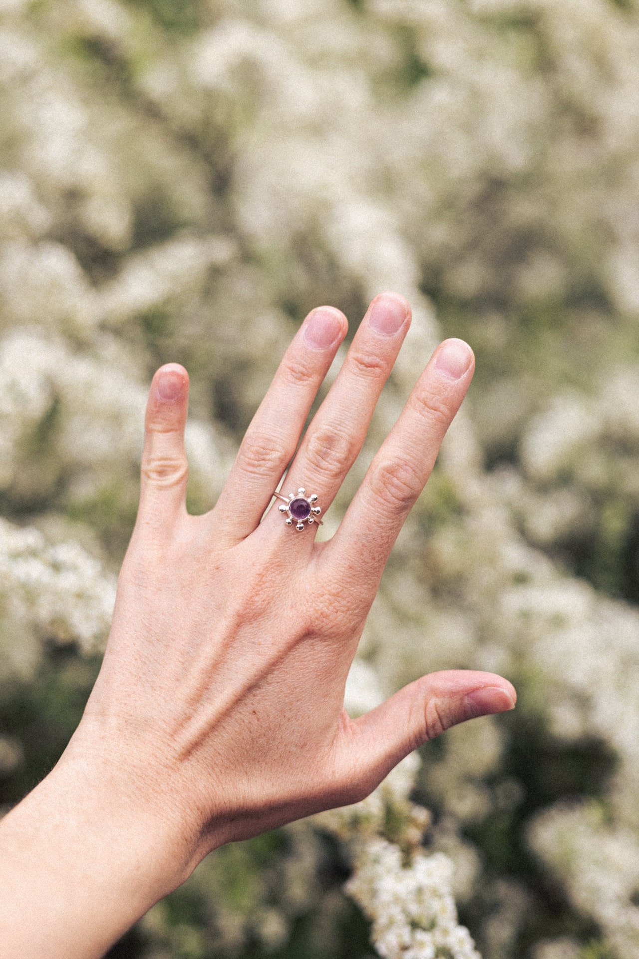 Pierścionek KWITNĄCA WIŚNIA to zawiadiacki pierścionek z sześciomilimetrowym fioletowym ametystem (jasny lub ciemny kaboszon) i nieregularnymi kulkami dookoła. Wykonany techniką odlewu. Jedyne możliwe wykończenie w tym modelu to poler.